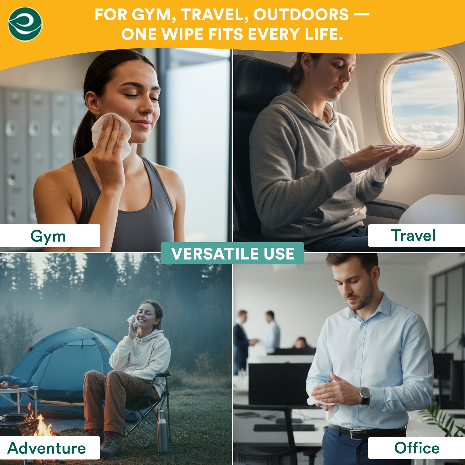 Stay fresh anytime, anywhere with EcoSoul Plant-Based Shower Body Wipes. Made for daily hygiene and on-the-go cleansing, these extra-large wipes (11.8” x 9.5”) are infused with soothing aloe vera and chamomile to gently cleanse, hydrate, and refresh your skin without water. The no-rinse formula makes them perfect for travel, gym sessions, camping, bedside care, post-workout use, or anytime a shower isn’t possible.