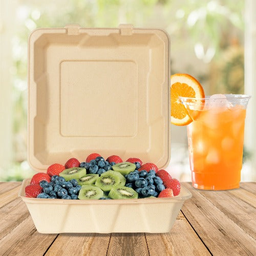 Our plant-based, compostable clamshells are made from sugarcane fiber. Simply put, bagasse is the leftover sugarcane fiber that remains after extracting juice from the sugarcane stalks. By repurposing this natural extract, we make your gatherings guilt-free and gentle towards the planet.