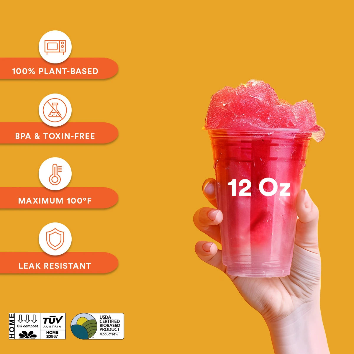 To be precise, these 12oz compostable cups are made from polylactic acid (PLA), which is a naturally occurring substance present in plants like sugarcane or corn. In our case, our cold cups are made from PLA extracted from corn starch. Besides being plant-based, these cold cups are also certified compostable. With that being said, here's what you need to know while shopping for our 12oz party cups online: